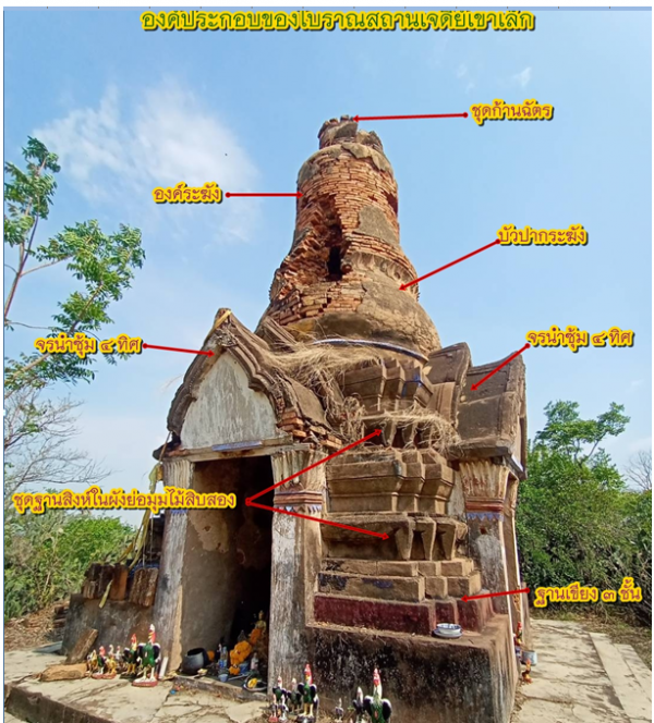 โบราณสถานเจดีย์เขาเล็กนับเป็นหลักฐานแสดงถึงชุมชนสมัยอยุธยาตอนปลาย – สมัยรัตนโกสินทร์ตอนต้น ที่อาศัยอยู่รอบเขาเล็ก ร่วมสมัยกับชุมชนอื่นๆในพื้นที่อำเภอห้วยกระเจา – พนมทวน เช่นชุมชนบริเวณวัดเขารักษ์ วัดเขาจำศีล และวัดบ้านน้อย เป็นต้น ชุมชนโบราณเหล่านี้มักตั้งถิ่นฐานอิงอยู่กับลำน้ำจระเข้สามพันและลำน้ำสาขาซึ่งเป็นเส้นทางสัญจรหลักมาตั้งแต่อดีต
